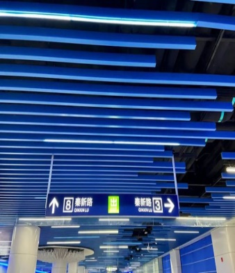 “绿色发展”视觉传达体现在地铁站的站厅及出入通道的环境设计中,例如,南京地铁2号线西延线,车站以蓝色标识为主,延续了2号线的车站标志颜色,体现了艺术风格的统一性和识别性,与河西鱼嘴湿地公园的生态底色相呼应,启发公众保护生态家园。