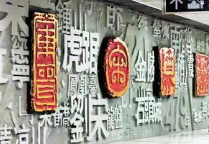 南京丰富的城市文化遗产融入地铁空间,不仅传播和发展了城市文化,还使南京独特的文化属性和张扬的城市个性更加鲜明。设计师通过文字、壁画和符号等传达形式,在南京地铁站空间,通过城市文化的视觉表现,实现南京城市文化的凝练、彰显、传播。例如,鼓楼站1号线车站的文化艺术墙的主题是“六朝古都”,通过六个朱红金印的镶嵌与布局,彰显南京历史文化中的龙盘虎踞气概,凸显南京城市文化的古都特征(如图7)。