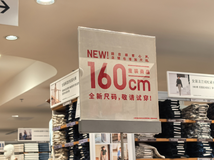优衣库店内的“回应顾客心声,童装商品增加160cm全新尺码”告示牌。